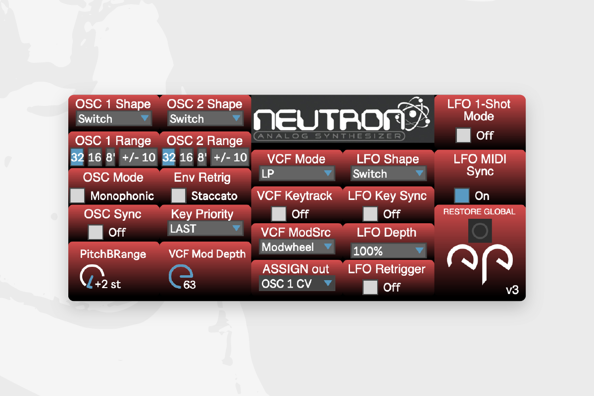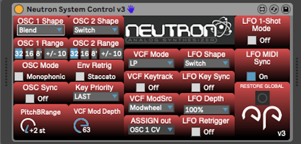 This is a Max 4 Live MIDI effect that should be placed before External Instrument on a MIDI Track in Ableton Live. The device sends out MIDI SysEx messages to control the parameters on the synthesiser. All these parameters are accessible manually on the synth as well, however they require the user to memorise what button to hold and which dial to use for setting them. The device functions almost the same as the official Neutron App – with its own advantages and disadvantages; the M4L device is more comfortable to use within Live, but it works one-way only sending data to the synthesiser. If you change a parameter manually on the synth, the GUI can’t adjust itself to reflect the current value – this is due to SysEx not being sent out from hardware, so there is currently no way of monitoring these in Max/Live.