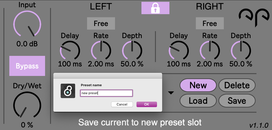 A simple true stereo chorus audio effect. You can choose wether to link the parameters of the left and right channel or adjust them separately. There is an option to save/recall presets, as well as saving/loading external files.